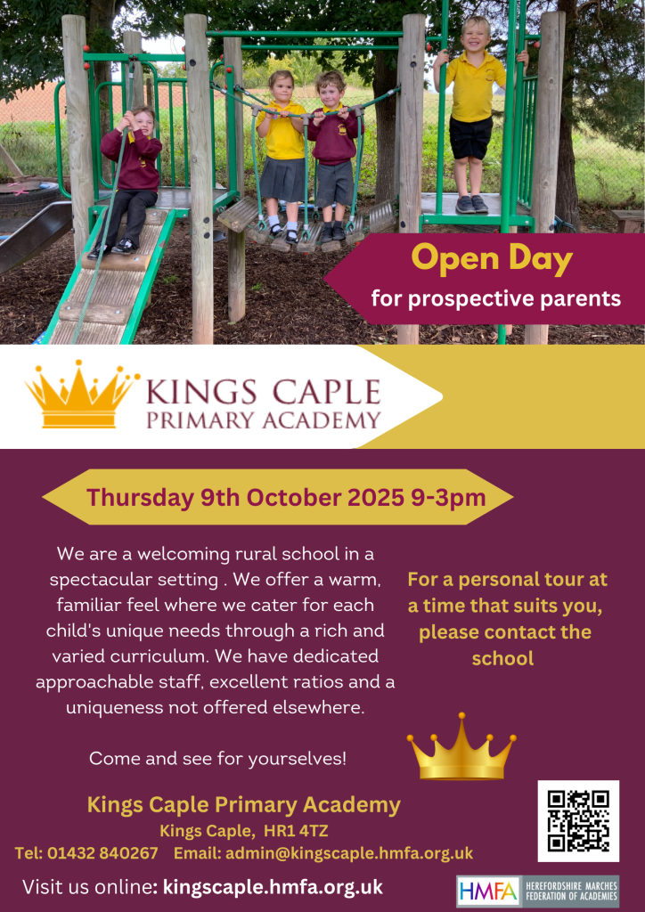 Kings Caple Primary Academy are hosting their official Open Day for prospective parents on Thursday 9th October. This is great opportunity to view the school in action and talk to all the staff.